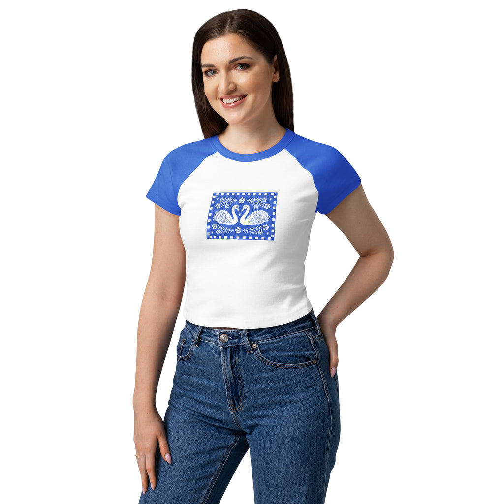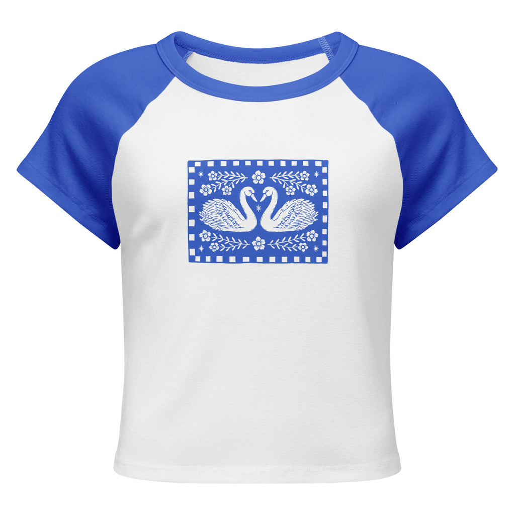 Based on my popular folk art style swan love bird linocut print, I bring you a cutie tee version. Soft, feminine, and easy to style—this baby tee updates a classic baseball-inspired design. With its fitted cut, mid-length body, and soft ribbed texture, it pairs effortlessly with jeans, shorts, or joggers for a casual, flattering look.