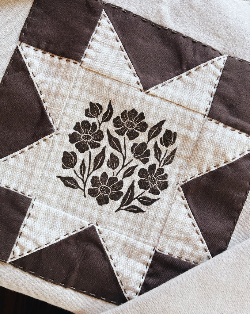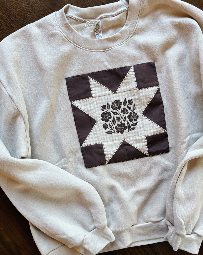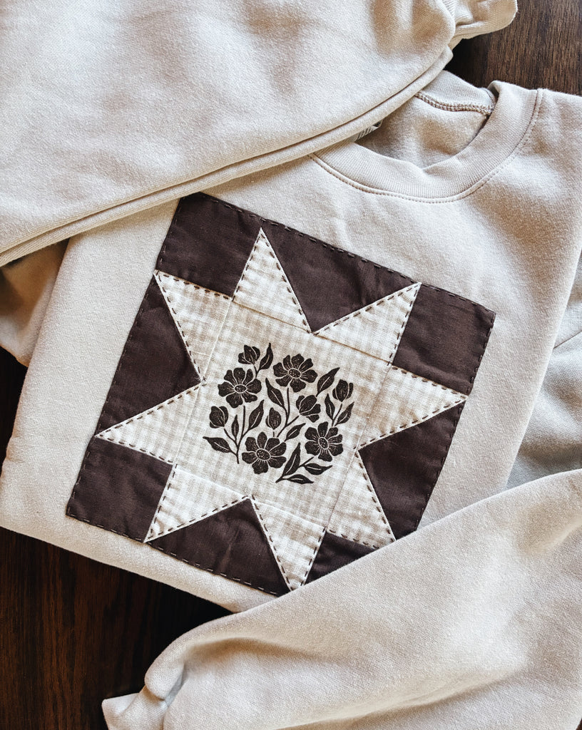• quilt block is ~5.5/6” square. Made with brown cotton & an oatmeal checked linen. Printed florals in centre in brown ink. Hand stitched onto sweatshirt with matching brown thread.