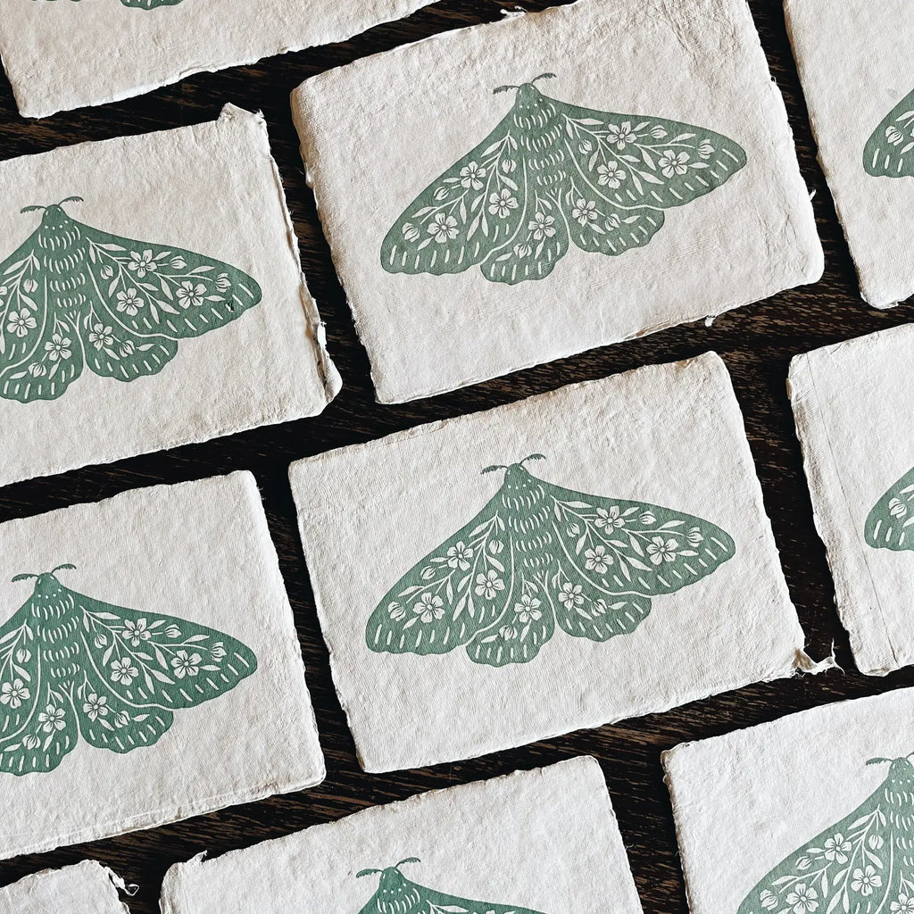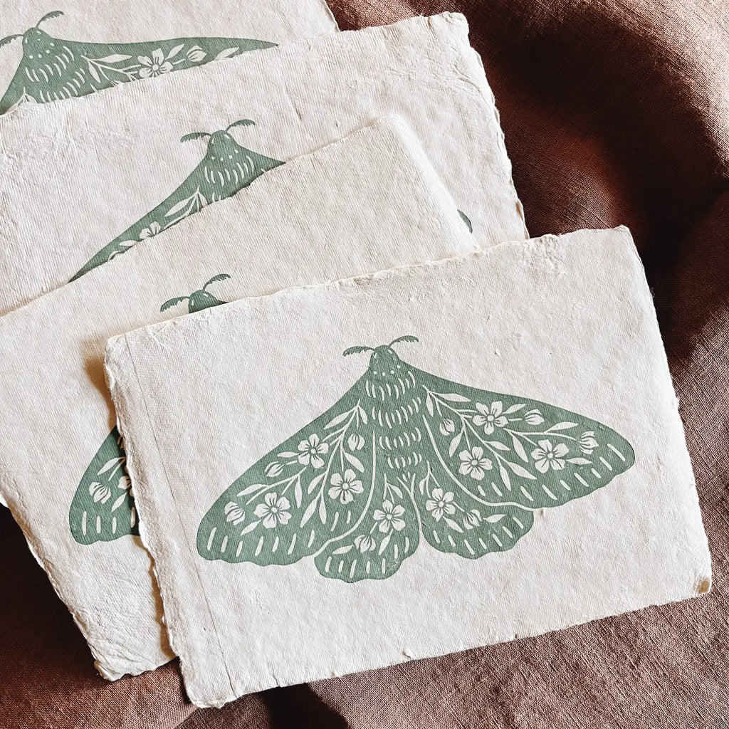 This floral moth print was hand-carved and printed from my original design. I printed it with a soft seafoam green archival ink on handmade white paper - it has a beautiful deckled edge and natural texture that gives it an organic, timeless feel. It features a lovely moth, with floral details in the wings. The moth body is seafoam green, and the negative space of the detailing in the wings shines through in white from the handmade paper.