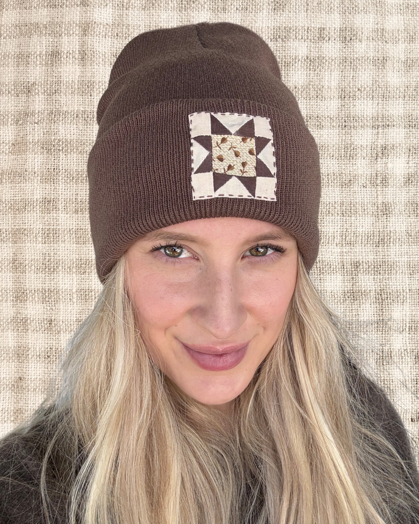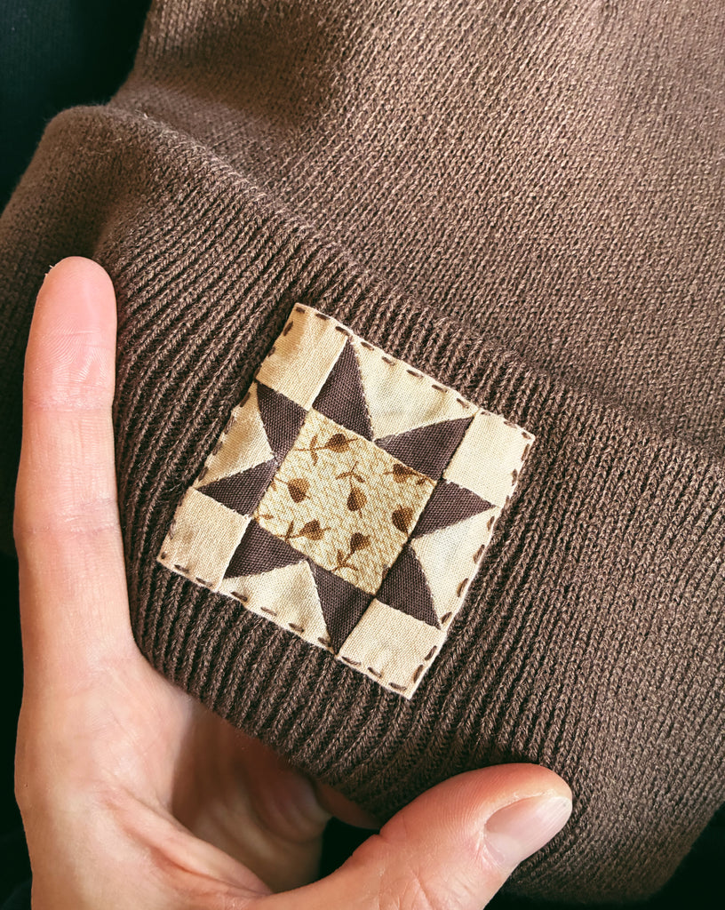 These adorable little beanies may look small and cute, but are still a labor of love! I have so much fun pairing fabrics, cutting, piercing, and sewing the blocks. Then they are attached with appliqué iron on adhesive, then stitched securely onto the beanie, and finished with a swipe of thread lock on the edges to prevent any fraying. Obviously you need to be a bit careful when there is a patch on something stretchy, that it doesn’t stretch beyond what the thread can handle, or else you risk the thread breaking. Beanies are purchased wholesale from shirtspace, not handmade by me.