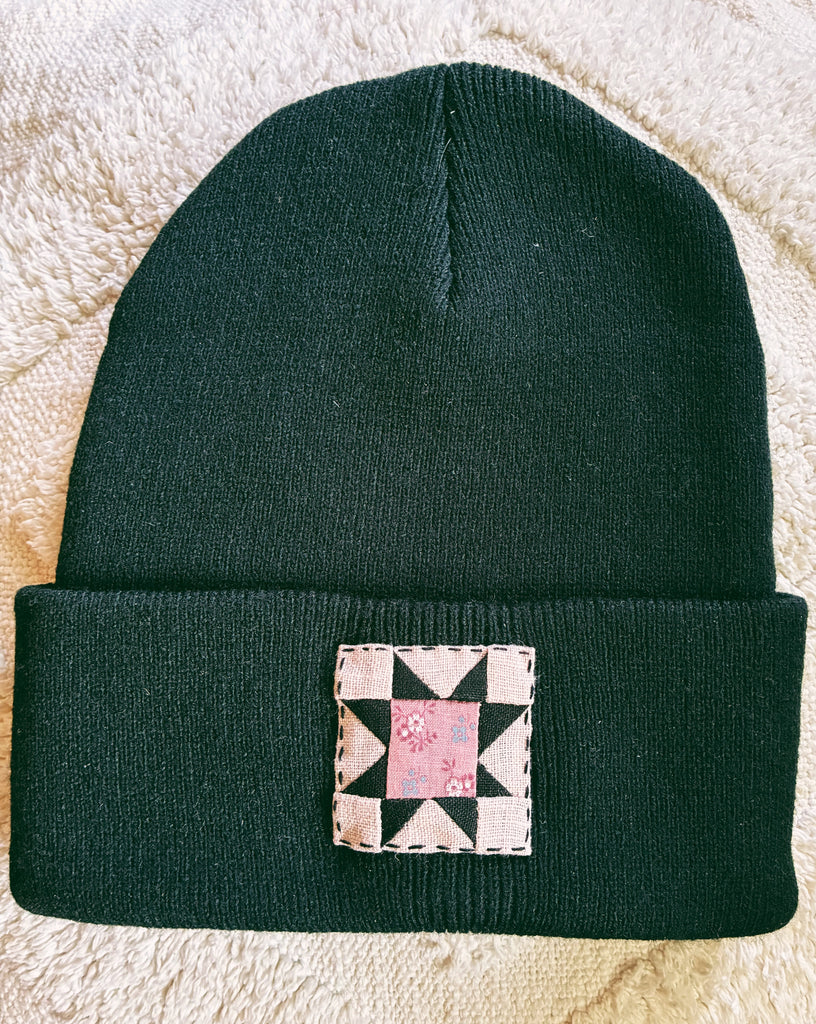 These adorable little beanies may look small and cute, but are still a labor of love! I have so much fun pairing fabrics, cutting, piercing, and sewing the blocks. Then they are attached with appliqué iron on adhesive, then stitched securely onto the beanie, and finished with a swipe of thread lock on the edges to prevent any fraying. Obviously you need to be a bit careful when there is a patch on something stretchy, that it doesn’t stretch beyond what the thread can handle, or else you risk the thread breaking. Beanies are purchased wholesale from shirtspace, not handmade by me.