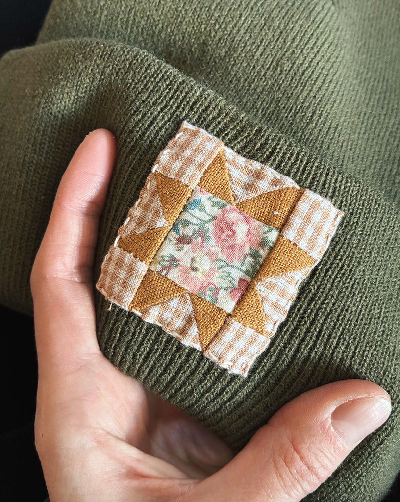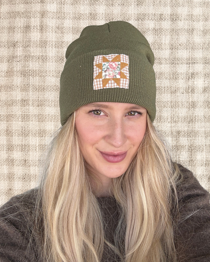 These adorable little beanies may look small and cute, but are still a labor of love! I have so much fun pairing fabrics, cutting, piercing, and sewing the blocks. Then they are attached with appliqué iron on adhesive, then stitched securely onto the beanie, and finished with a swipe of thread lock on the edges to prevent any fraying. Obviously you need to be a bit careful when there is a patch on something stretchy, that it doesn’t stretch beyond what the thread can handle, or else you risk the thread breaking. Beanies are purchased wholesale from shirtspace, not handmade by me.
