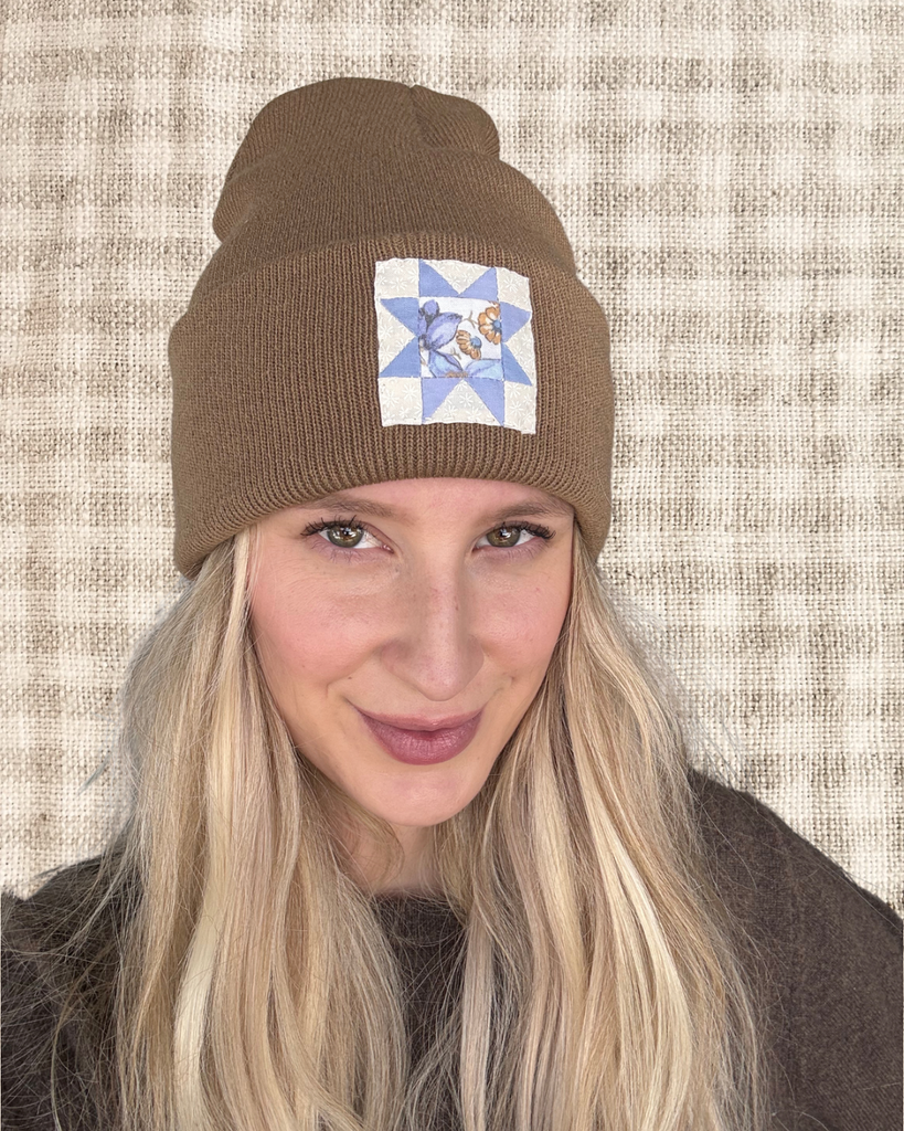 These adorable little beanies may look small and cute, but are still a labor of love! I have so much fun pairing fabrics, cutting, piercing, and sewing the blocks. Then they are attached with appliqué iron on adhesive, then stitched securely onto the beanie, and finished with a swipe of thread lock on the edges to prevent any fraying. Obviously you need to be a bit careful when there is a patch on something stretchy, that it doesn’t stretch beyond what the thread can handle, or else you risk the thread breaking. Beanies are purchased wholesale from shirtspace, not handmade by me.