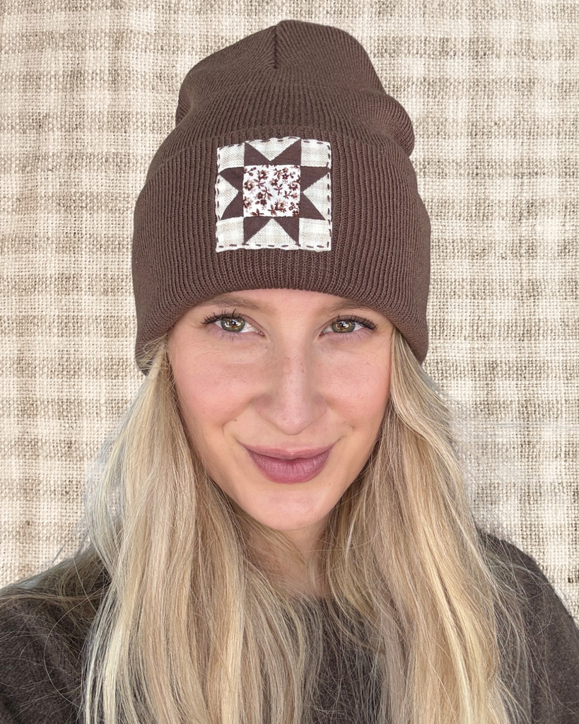 These adorable little beanies may look small and cute, but are still a labor of love! I have so much fun pairing fabrics, cutting, piercing, and sewing the blocks. Then they are attached with appliqué iron on adhesive, then stitched securely onto the beanie, and finished with a swipe of thread lock on the edges to prevent any fraying. Obviously you need to be a bit careful when there is a patch on something stretchy, that it doesn’t stretch beyond what the thread can handle, or else you risk the thread breaking. Beanies are purchased wholesale from shirtspace, not handmade by me.