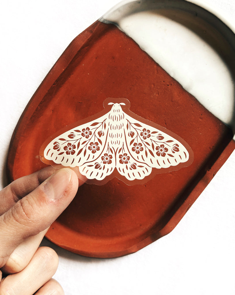 Adding to my floral moth collection, we have a delicate moth in a warm off-white, with a clear background. The original hand illustrated floral detailing in the moths wings will take on whatever color surface you choose to adhere the sticker to. Perfect for bug loving, nature enthusiasts, and those who love minimalist artist renderings of elements found outside.