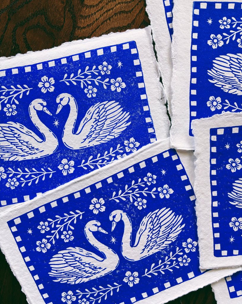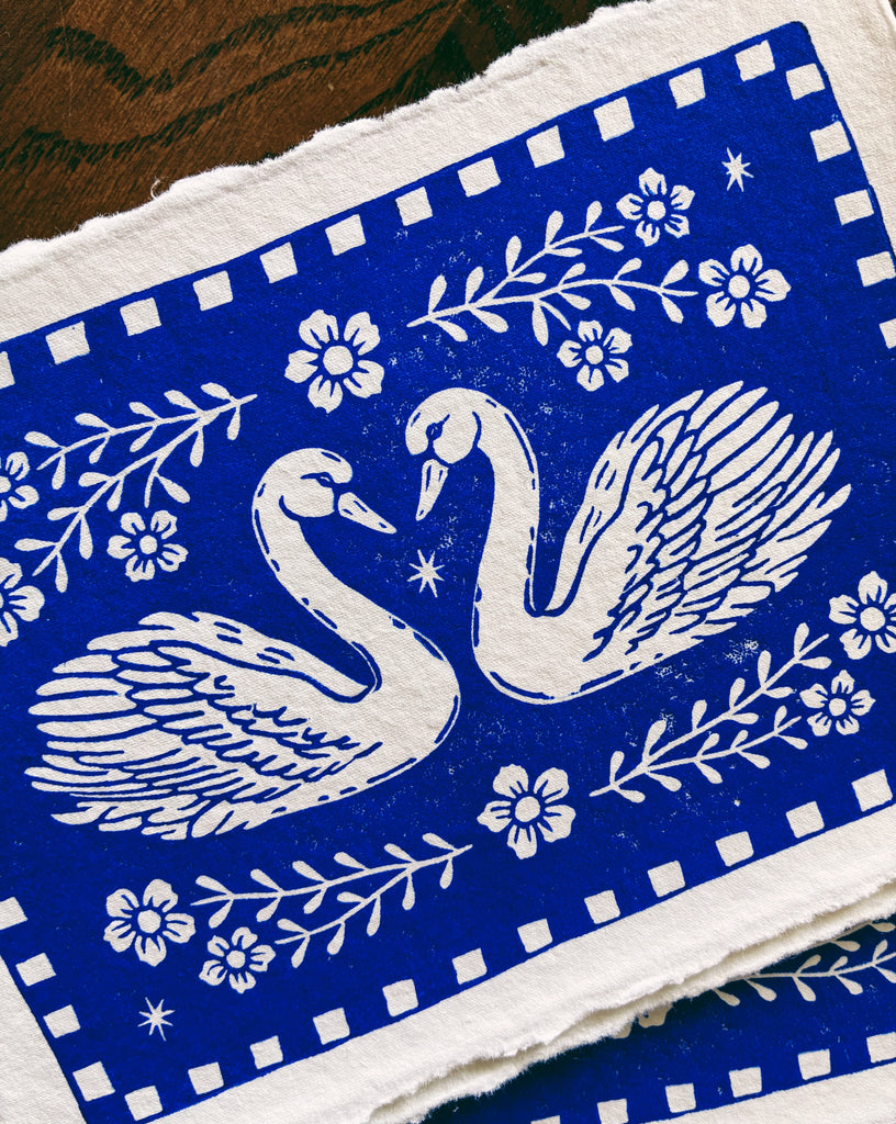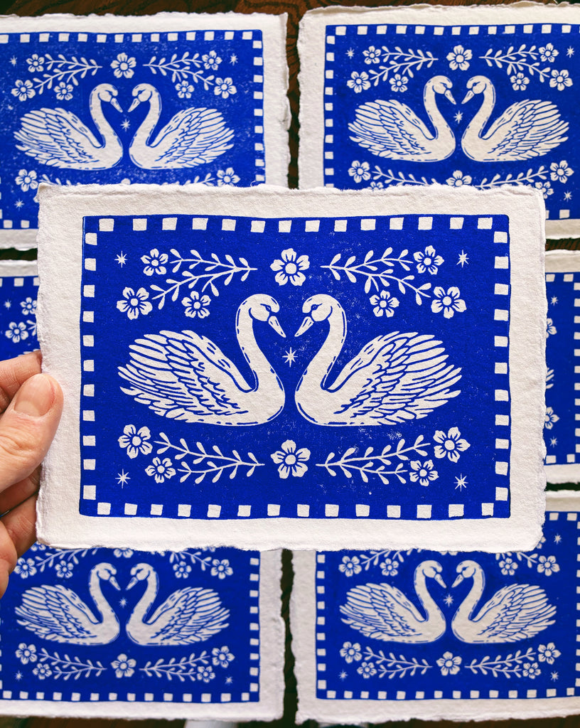 Printed in a vivid ultramarine blue (it’s bright blue) archival ink on white handmade paper, the design blends traditional folk art motifs with a fresh, modern skater-style. additionally, a quilt-like checkered border frames the swans, creating a piece that feels both heirloom and contemporary.