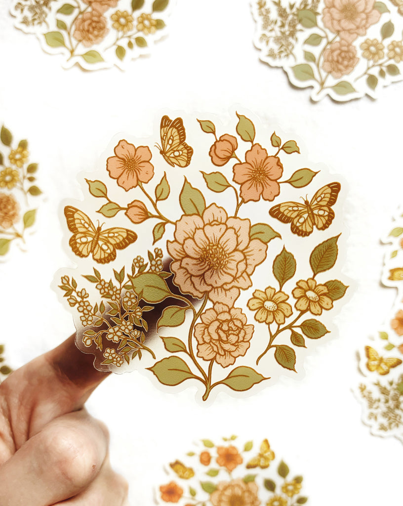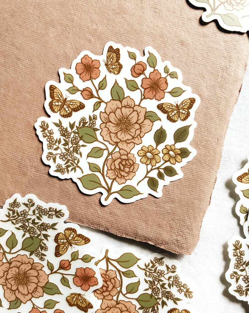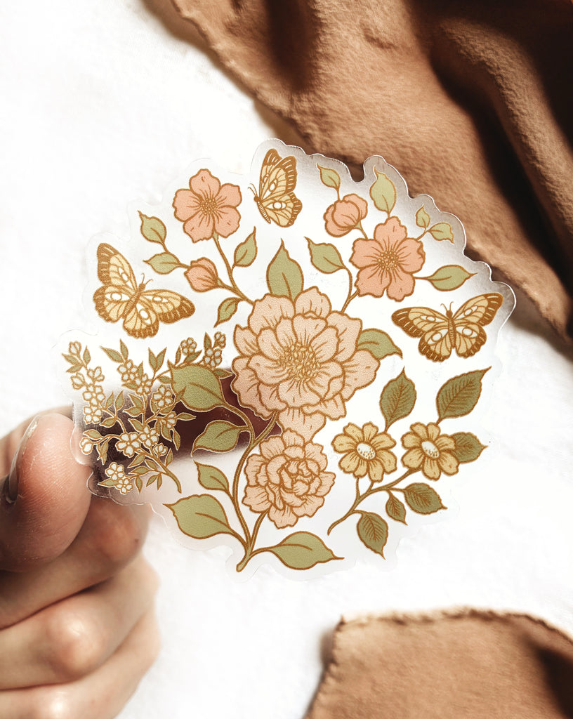 Timeless beauty meets enchanted fairytale vibes with this durable vinyl sticker. Featuring warm vintage-inspired blooms and delicate butterflies, this design is perfect for anyone who loves cottagecore, gardening, and nature. Design is on a CLEAR sticker background, so it will take the color of whatever surface the sticker is adhered to. It is an original hand illustrated design by Flora West, and is actually a little sample of our Enchanted Garden Silk scarf design. Each sticker is printed on weather resistant vinyl, making it ideal for decorating laptops, water bottles, phone cases, journals, or gifts. Whether you're a flower lover, butterfly admirer, or just love cozy vintage aesthetics, this sticker adds a charming detail wherever you place it.